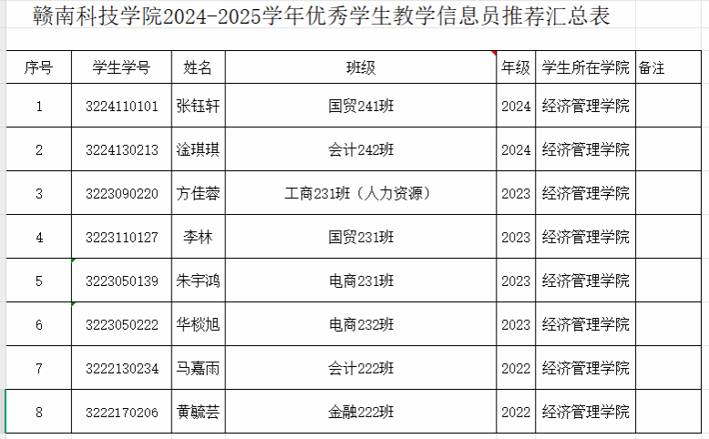 根据《赣科院教字(2024)4号关于印发《yl6809永利教学信息员制度(试行)》的通知》要求,经员工个人申请、yl6809永利审核等程序,拟推荐国贸241班张钰轩等8位同学为优秀员工教学信息员初评人选,现将初评人选的相关情况公示如下(按年级学号排序):
