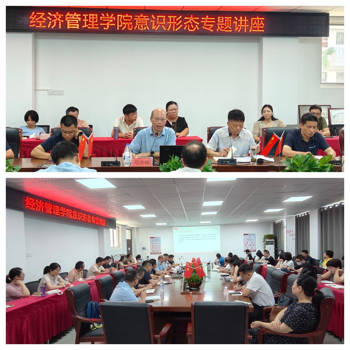 邓亦林围绕“意识形态是什么、为什么、做什么、有什么、怎么做”等五个维度系统展开讲解。讲座从理论层面阐释意识形态的核心内涵与战略意义,明确指出高校是意识形态工作的前沿阵地,强调员工必须始终牢牢把握 “为谁培养人、培养什么人、怎样培养人” 这一教育根本问题,将意识形态引领贯穿教育教学全过程。随后,邓亦林结合相关典型案例,深入剖析当前高校意识形态领域面临的风险挑战,强调立德树人是教育的初心所系、使命所在。就如何做好意识形态工作,邓亦林提出了四点建议:一是明确职责,教书育人;二是守好底线,坚定理想;三是站稳立场,敢于斗争;四是用好网络,守好阵地。邓亦林强调,意识形态工作没有“休止符”,只有“进行曲”;没有“旁观者”,只有“战斗员”。希望全体员工以“三尺讲台”为站位,以“立德树人”为使命,用“明确职责”的清醒、“守好底线”的坚定、“敢于斗争”的勇毅,“筑牢阵地”的担当,共同筑起新时代高校意识形态的“钢铁长城”,为培养担当民族复兴大任的时代新人贡献智慧和力量。
