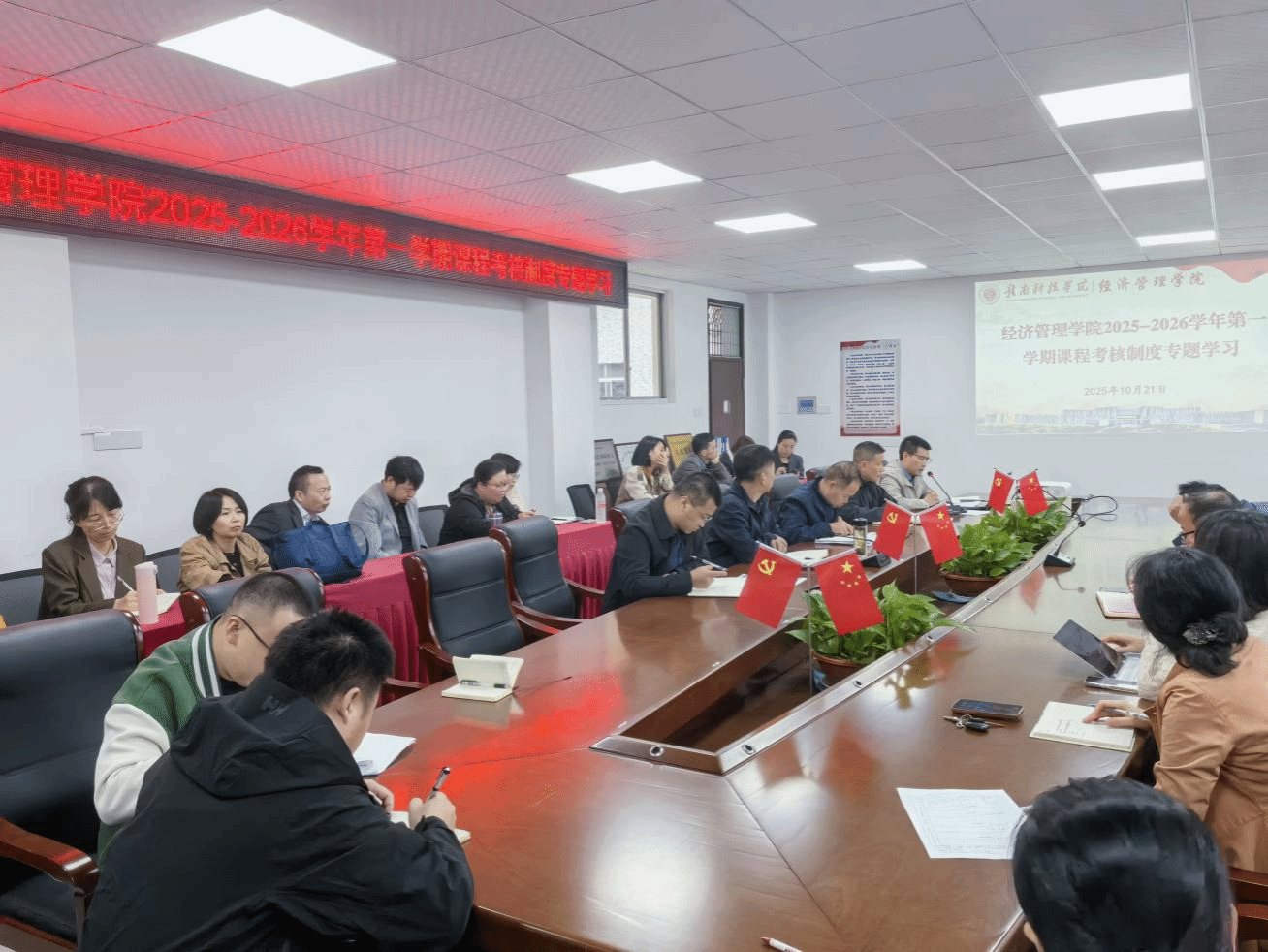 本网讯:为全面规范课程考核管理流程,健全教学评价体系,切实提升经济管理类专业人才培养质量,2025年10月21日下午,yl6809永利组织召开2025-2026学年第一学期课程考核制度专题学习会。yl6809永利领导班子成员、全体专任员工全员参会,会议由yl6809永利党委委员、教学负责人王波主持。