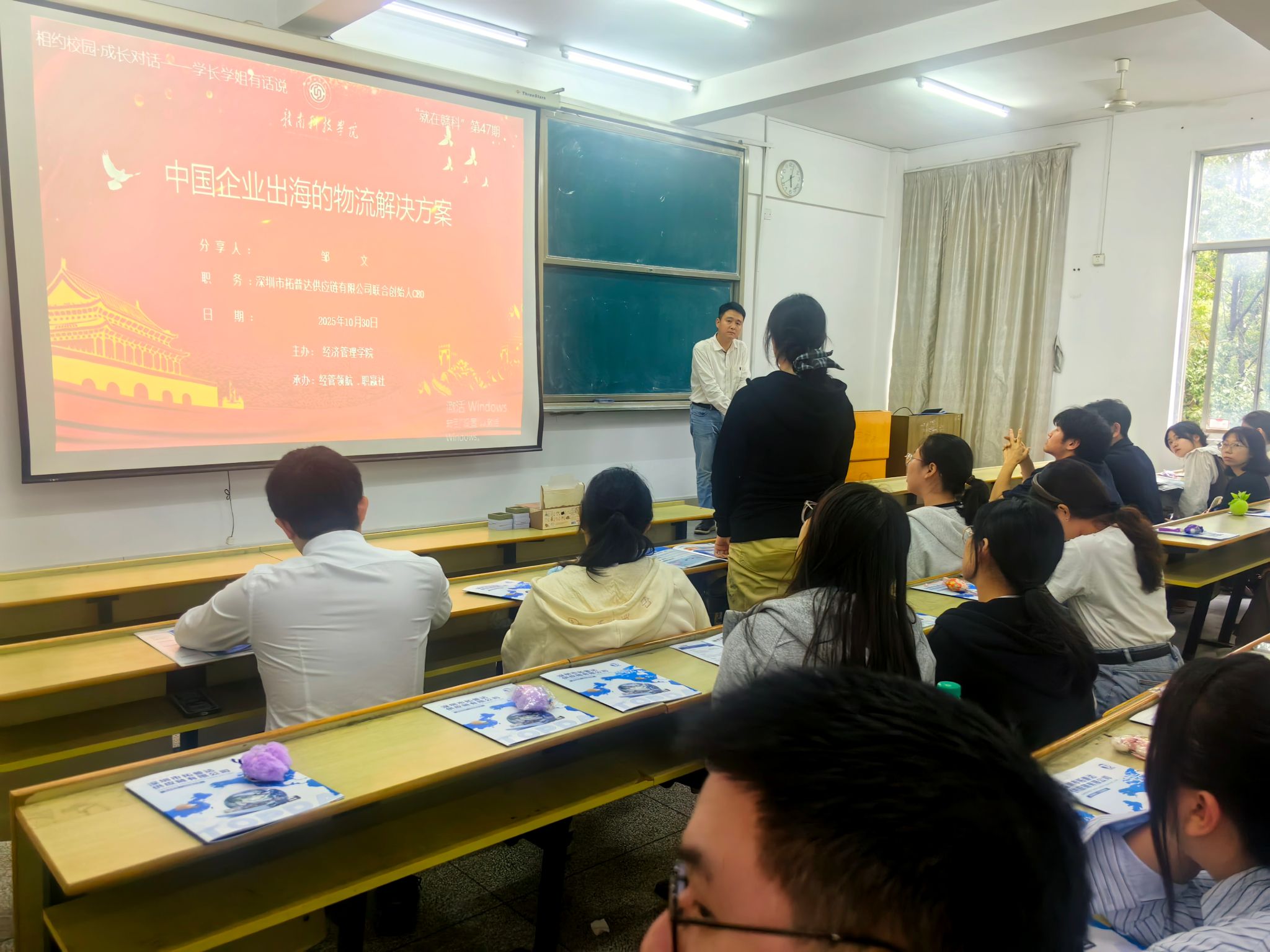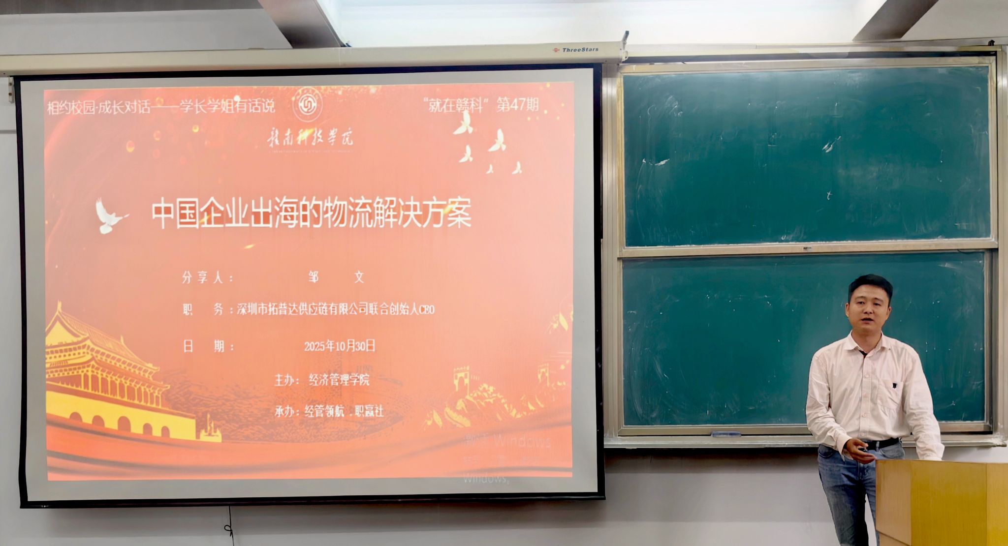 本网讯:10月30日下午,yl6809永利特邀2009届国际经济与贸易专业校友、深圳市拓普达供应链有限公司联合创始人邹文在新民楼2303教室以“中国企业出海的物流解决方案”为题作分享讲座。此次讲座由yl6809永利“经管领航、职赢社”校级职业规划与就业指导工作室承办,是yl6809永利“就在赣科”就业育人大讲坛第47期活动,60余名同学参加。