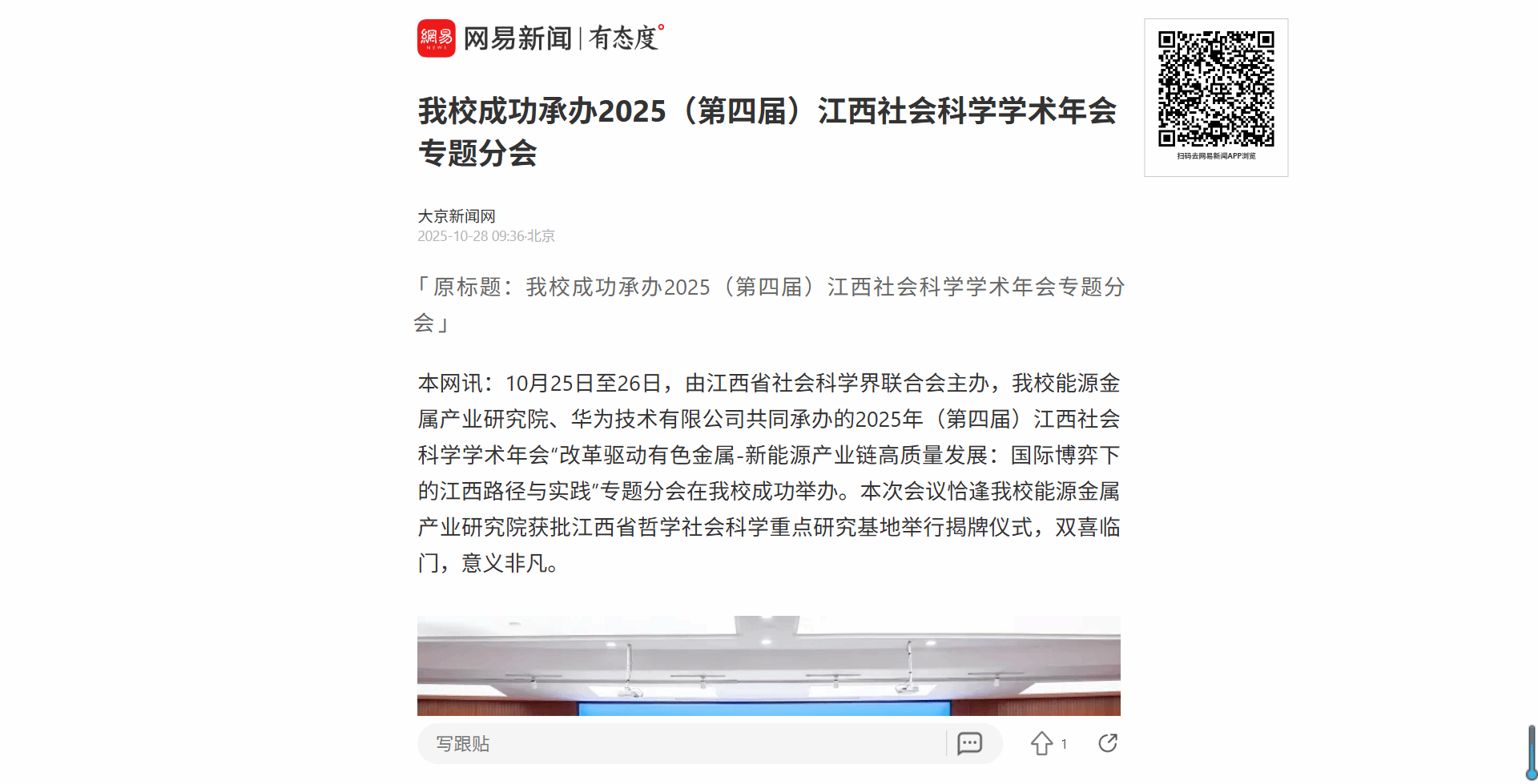 本网讯:10月25日至26日,由江西省社会科学界联合会主办,yl6809永利能源金属产业研究院、华为技术有限公司共同承办的2025年(第四届)江西社会科学学术年会“改革驱动有色金属-新能源产业链高质量发展:国际博弈下的江西路径与实践”专题分会在yl6809永利成功举办。本次会议恰逢yl6809永利能源金属产业研究院获批江西省哲学社会科学重点研究基地举行揭牌仪式,双喜临门,意义非凡。