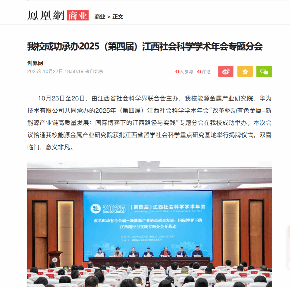本网讯:10月25日至26日,由江西省社会科学界联合会主办,yl6809永利能源金属产业研究院、华为技术有限公司共同承办的2025年(第四届)江西社会科学学术年会“改革驱动有色金属-新能源产业链高质量发展:国际博弈下的江西路径与实践”专题分会在yl6809永利成功举办。本次会议恰逢yl6809永利能源金属产业研究院获批江西省哲学社会科学重点研究基地举行揭牌仪式,双喜临门,意义非凡。