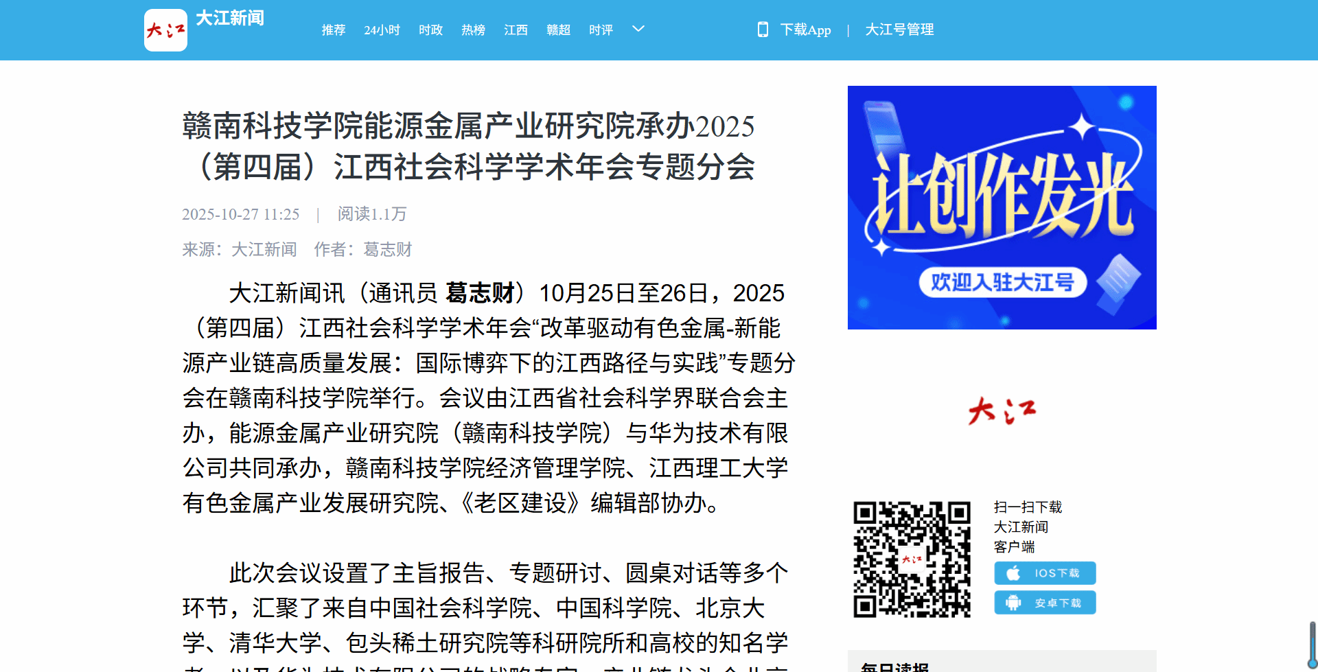 大江新闻讯(通讯员 葛志财)10月25日至26日,2025(第四届)江西社会科学学术年会“改革驱动有色金属-新能源产业链高质量发展:国际博弈下的江西路径与实践”专题分会在yl6809永利举行。会议由江西省社会科学界联合会主办,能源金属产业研究院(yl6809永利)与华为技术有限公司共同承办,yl6809永利yl6809永利、江西理工大学有色金属产业发展研究院、《老区建设》编辑部协办。